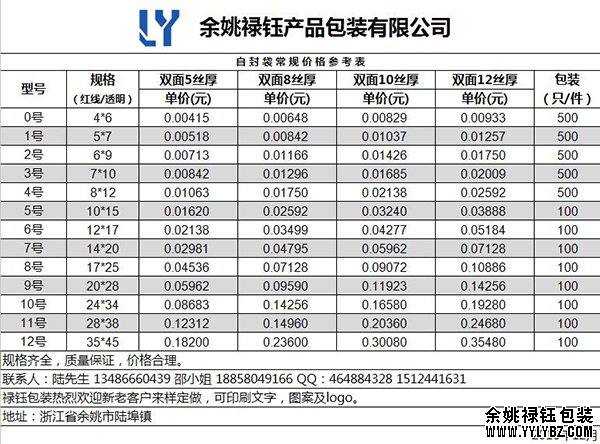 余姚祿鈺包裝常規自封袋價格表。對于很多需要用到自封袋的客戶來說,對于自己的產品需要用到多大的自封袋,自封袋價格是多少總是一件頭痛的事。